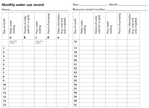 Select the record type you require from the Excel files below and save it to your computer. Your resource consent condition should specify how often you need to send water use records to Waikato Regional Council. Contact us if you are unsure.